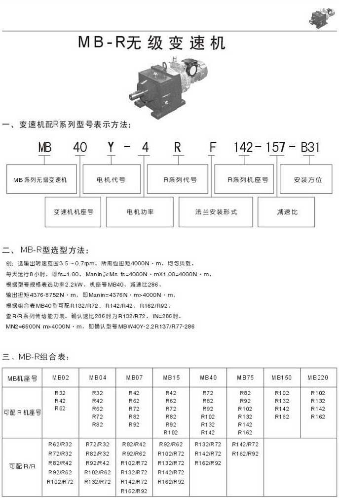 MB-R無(wú)級(jí)變速機(jī)型號(hào)表示法選型方法MB-R組合表